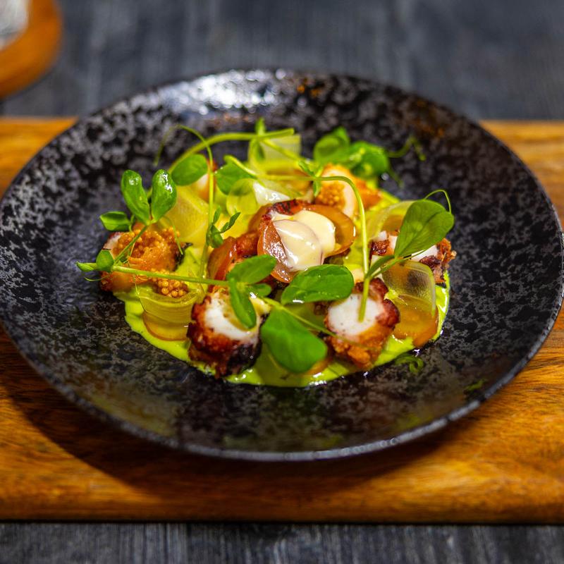 Braised octopus, salsa shishito, pickled grape, yuzu aioli.
